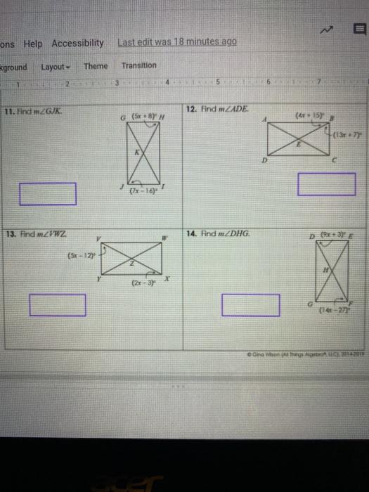 Determine whether each quadrilateral is a parallelogram ... from us-static.z-dn.net There is a 90% chance she will chose gray for the living room. Try drawing a quadrilateral, and measure the angles. I'm looking for a general solution given any values for these angles that form a convex quadrilateral. So 1/2 and the first diagnosed 15 and 15 was just 30. Learn vocabulary, terms and more with flashcards, games and other study tools. Bc = 28 and bd = 32 tu 16. Find the missing angle measure in the triangle given below. Find missing angle measures of quadrilaterals given a sum of 360 degrees.
